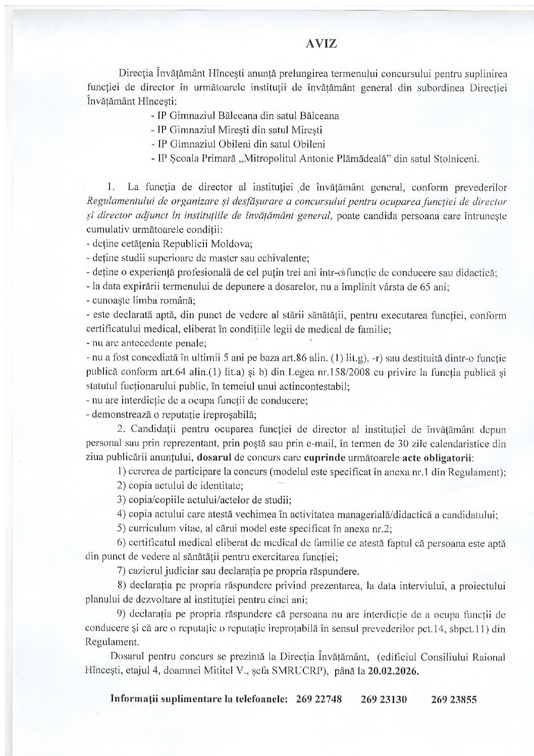 Direcţia Învăţământ Hînceşti anunţă prelungirea termenului concursului pentru suplinirea funcţiei de director în următoarele instituţii de învăţământ general din subordinea Direcției Învățământ Hîncești: